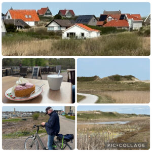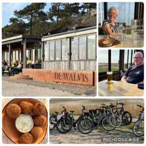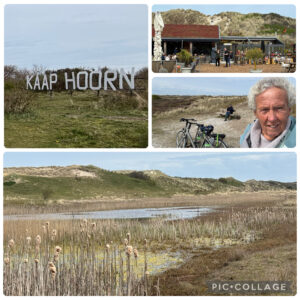 We vervolgen onze fietstocht richting Kaap Hoorn, een restaurant dat in de duinen blijkt te liggen en niet aan het strand. Ook goed. Het schijnt nieuw te zijn en ziet er leuk uit. De lunch is perfect en heel betaalbaar. We kunnen er weer tegen.