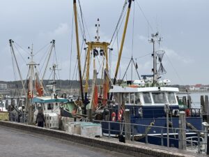 Terschelling begint het weer flink door te waaien. Dat is lastig met aanleggen. We moeten met de neus naar buiten tegen de steiger aan, waar een dikke dwarswind op staat. Maar het lukt, vanwege Jakobs geweldige manoeuvreer kunst. We steken alle stootwillen tussen de steiger en de boot en hopen dat de wind gaat afnemen.