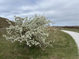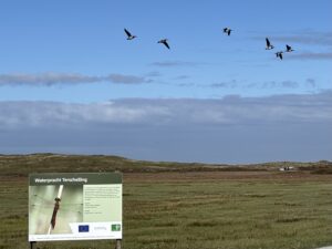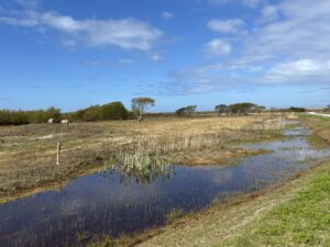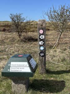 Een halfuur later zijn we in Oosterend en zoeken even welke kant we uit zullen gaan. We vinden een prachtig pad door de duinen, langs watertjes en weilanden. De lucht klaart steeds verder op en wordt tenslotte echt blauw. Wat is het mooi hier. Er zijn een paar fietsers en een echtpaar, dat met hun hondje wandelt. Wat is dat voorseizoen toch heerlijk rustig.