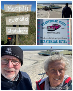 Dan ziet Jakob een vlaggenmast in de verte. Daar is vast het Heartbrake Hotel! En inderdaad, een half uur later klimmen we het duin over naar het strand. Wat een wijdsheid!