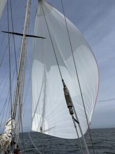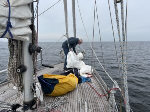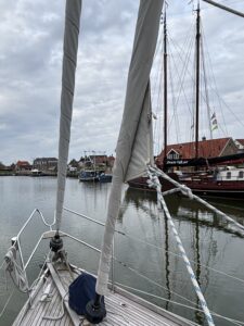 Vandaag maken we daar een start mee. We hebben tien dagen de tijd om weer te wennen aan de zeilboot bewegingen en het frisse weer aan dek. Rond 12 uur verlaten we de haven van Enkhuizen en zetten koers naar Makkum. Er is niet veel wind en Jakob stelt voor om de genaker uit de zak te halen. ik ben eerst wat terughoudend, want het is best een gedoe, maar we doen