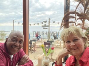 Haha, dan komt er een berichtje van Martin en Ellen, dat ze in Makkum zijn om te eten aan het strand. Als ik reageer dat wij net met de boot zijn aangekomen, kan het niet anders dan dat we elkaar gaan ontmoeten.