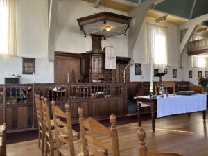Links van de preekstoel staan tafeltjes met stoelen klaar voor het koffiedrinken na de dienst. Er hangt een goede sfeer. De organist speelt met verve en laat na de preek fantastische muziek horen op zijn viool. Wat een talent. Tijdens het koffiedrinken praten we met mede