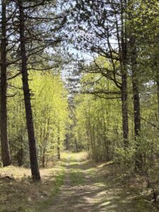 Na de lunch maken we een klein wandelingetje door het bos van West. Vooral om onze spieren los te houden. Er is geen wind in het bos, terwijl die stevig blaast in de haven. Heerlijk hier. Jakob vindt allerlei spannende padjes, die ons uiteindelijk toch weer bij de boot brengen.