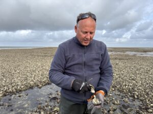 We ankeren voor de bank, waarbij de boot zich met de achterkant naar de plek draait waar we kunnen afstappen. Dan krijgen we al snel een glas wijn en maakt Werner de eerste oesters open. ‘Raap er maar één op, dan maak ik hem voor je open’, zegt hij. Al pratend lopen we over het wad, waarbij hij ons allerlei schelpdieren laat zien en proeven. Wat een avontuur.