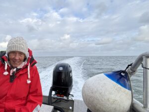 Intussen komt langzaam de vloed op en de boot ligt steeds verder van de kant. ‘Geen probleem hoor’, zegt Werner, ‘hou elkaar maar een beetje vast, dan komt het goed’. Het nut van de lieslaarzen wordt nu duidelijk. Het water is meer dan kniediep en voorzichtig waden we naar de boot. De opstap is voor mij een beetje te hoog geworden, maar met wat hulp kom ik toch aan boord.