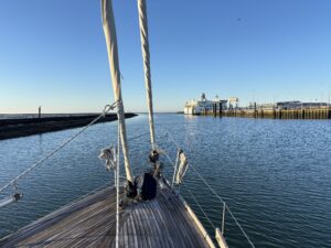 De wekker staat op 7 uur. Een kwartier voor die tijd zijn we alletwee wakker. Zo gaat dat, je slaapt erop. Zwijgend kleden we ons aan, koken water voor in de thermosfles en bereiden de boot voor om te kunnen vertrekken. De kuiptent gaat eraf, de kachelpijp wordt opgeborgen en de huiken gaan van de zeilen af. Een half uur later zijn we klaar voor vertrek. De lucht is blauw en de zon straalt ons al vriendelijk tegemoet. De wind is nog niet wakker, waardoor we makkelijk kunnen losmaken en wegvaren van de steiger.