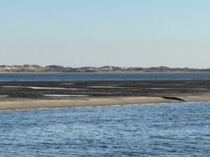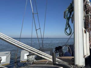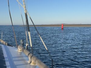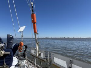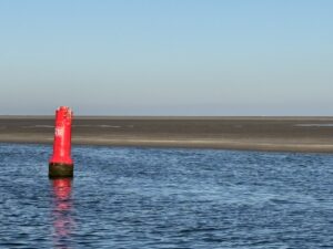 Rustig varen we het Schuitengat uit en genieten van het uitzicht over het wad nu het laagwater is. In de verte zien we een zeilboot met z’n zeilen omhoog. Verderop is dus wel wind. Bij de scheidingston van de Blauwe Slenk stuurt Jakob de boot in de wind en ga ik naar voren om het zeil te hijsen. Er staat al een flinke stroming en dan lijkt het of de tonnen magneten zijn. Voor je het weet ben je te dichtbij. Jakob rolt het voorzeil uit en stopt de motor. Wat een rust en wat is het mooi.