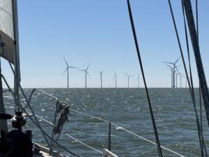 Vanuit de sluis zetten we koers naar Stavoren. De wind is pal achter, dus we maken een gijp vlak voor een windmolen van een park dat behoorlijk in de weg ligt.