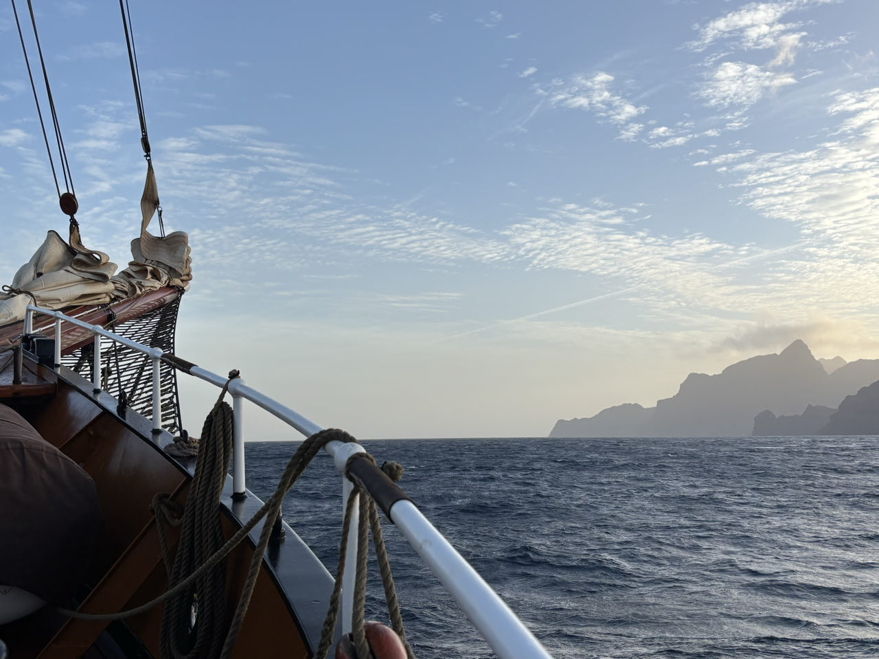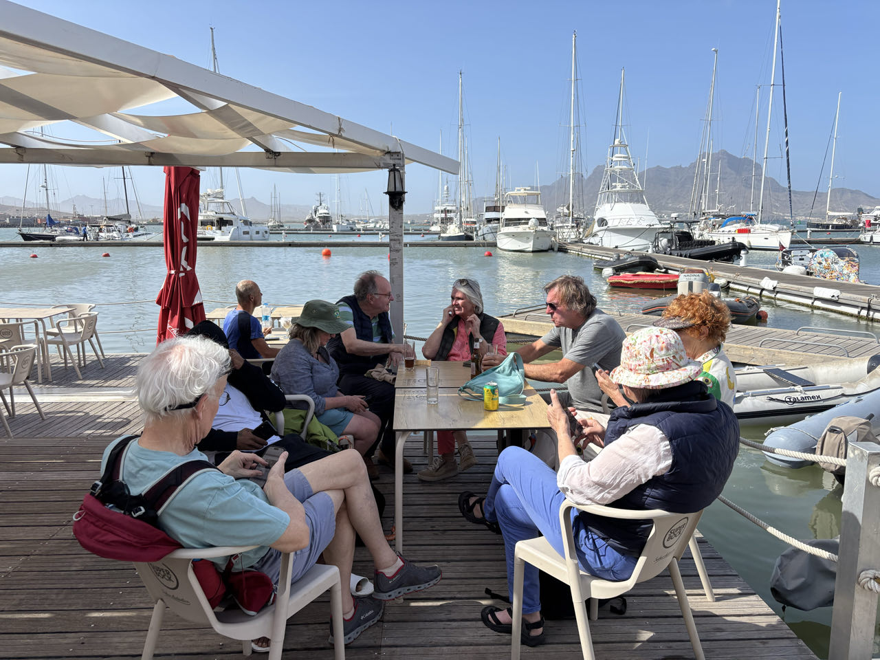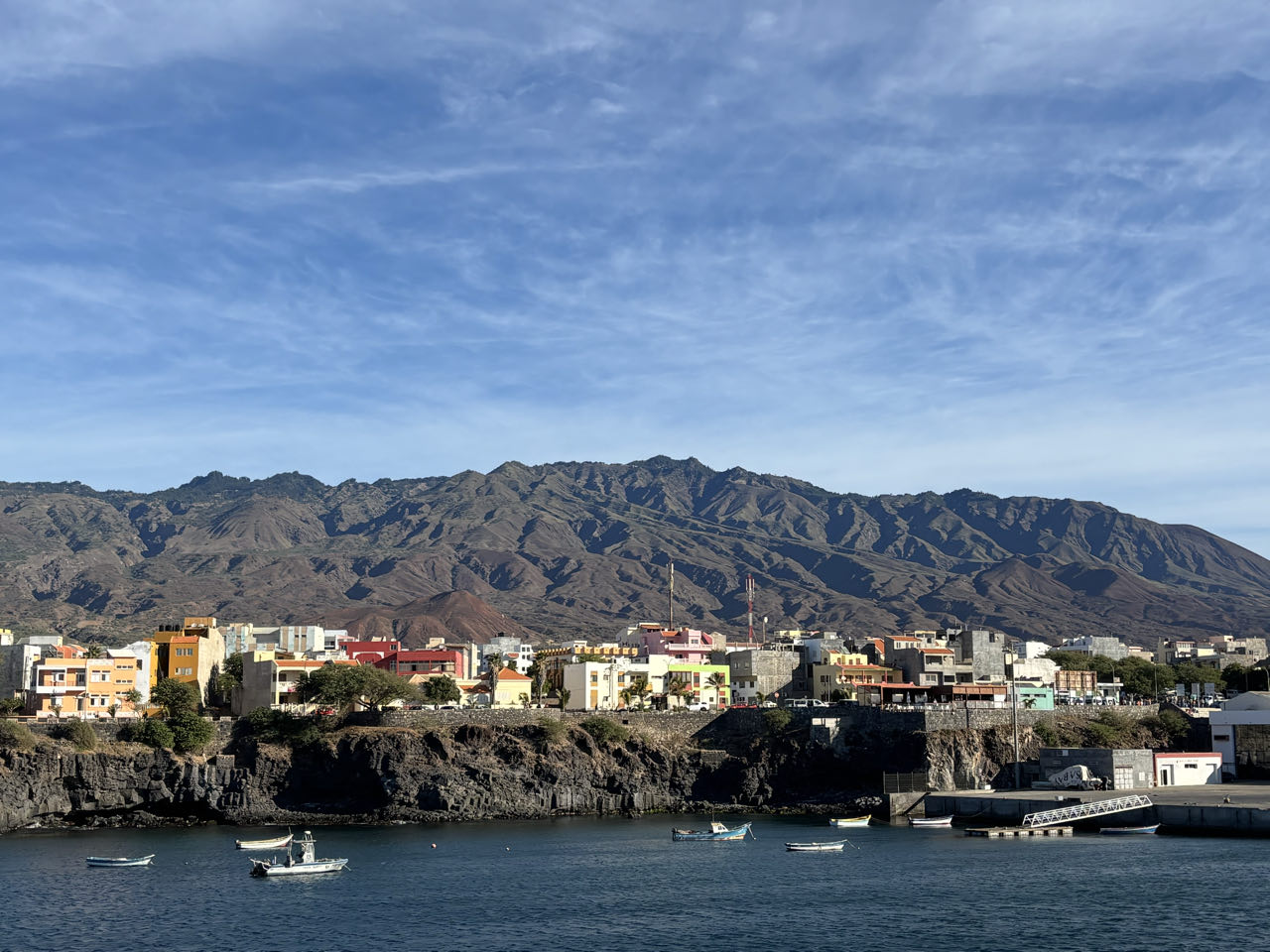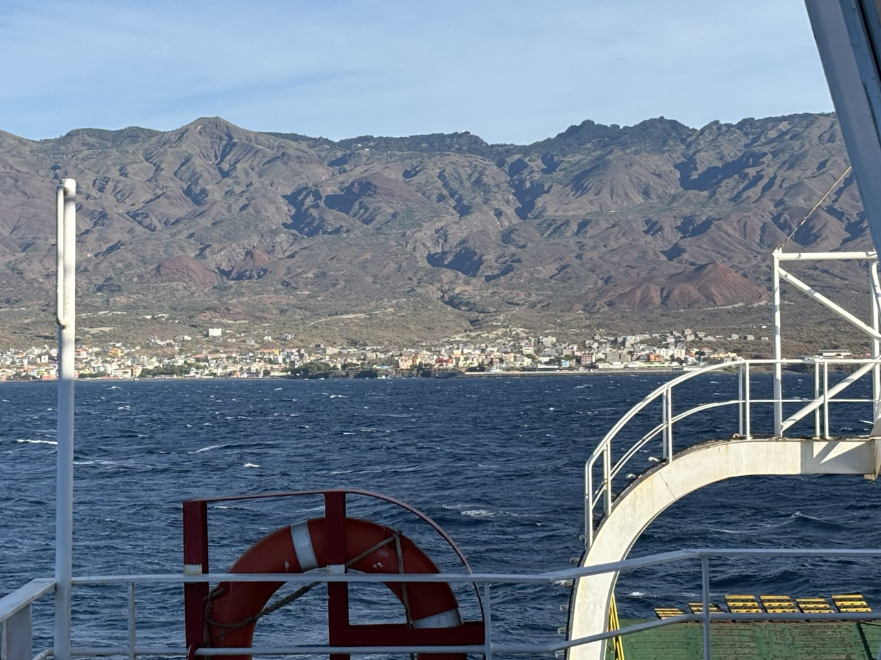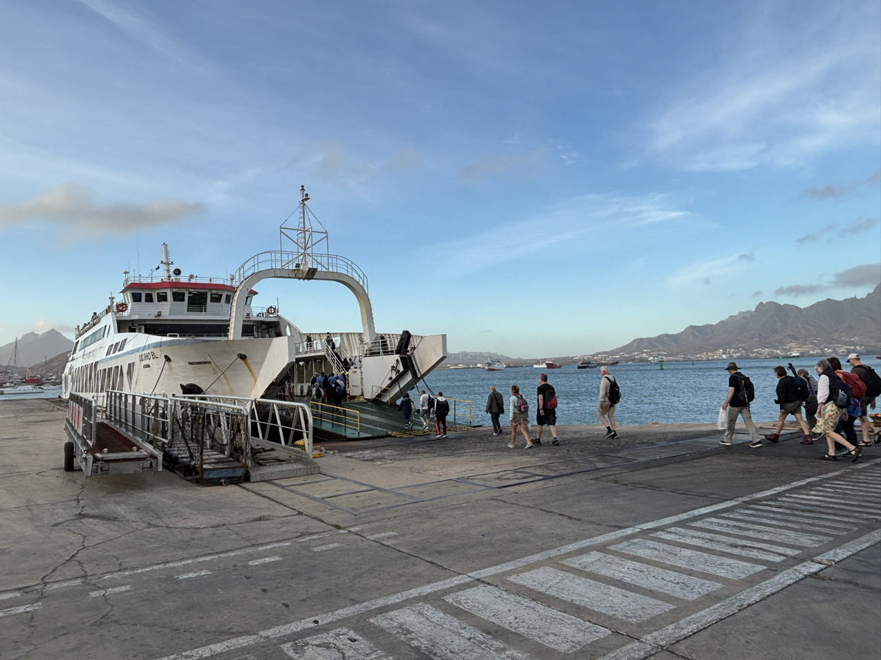 We staan extra vroeg op vandaag. Het ontbijt is om half zeven, want de pont naar San Antao vertrekt om 8 uur precies. Onze kapitein heeft de kaartjes geregeld en ervoor gezorgd dat er een gids met een busje voor ons klaar staat aan de overkant. Het is nog een beetje fris als we vertrekken, dus we doen een dunne trui over ons T-shirt aan.![]()