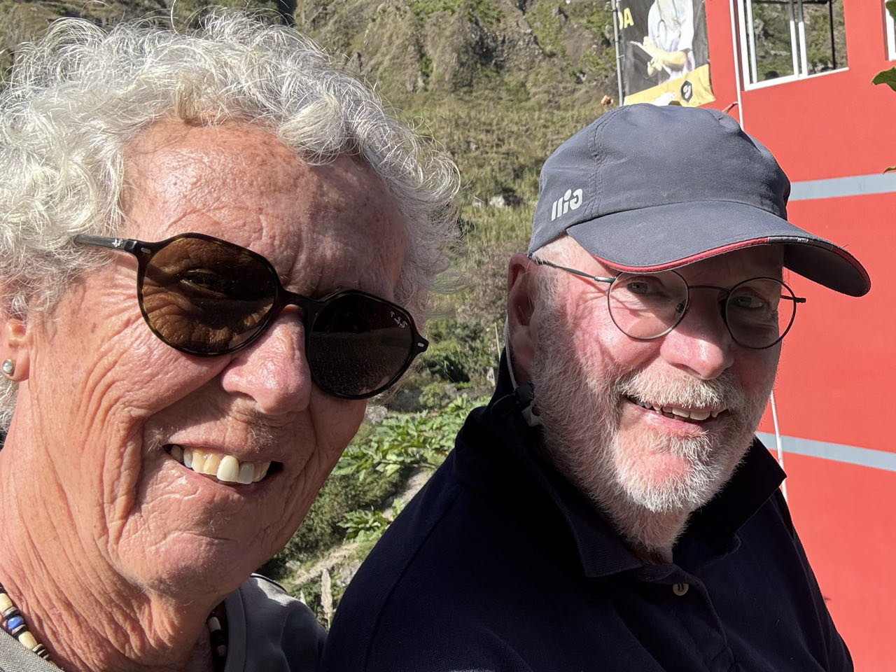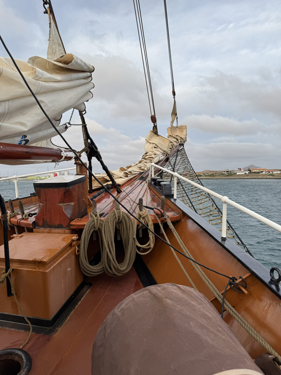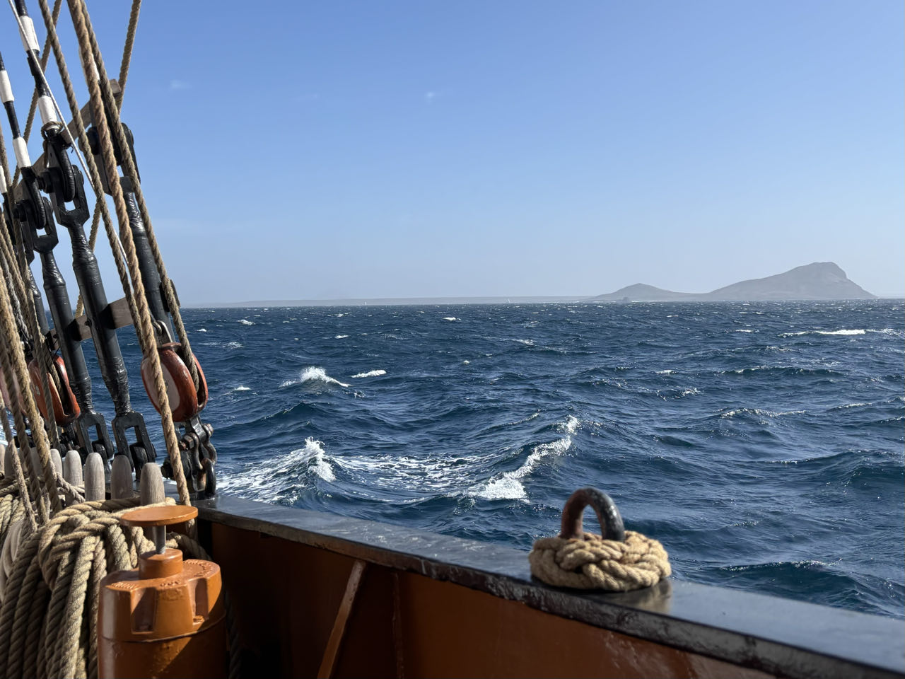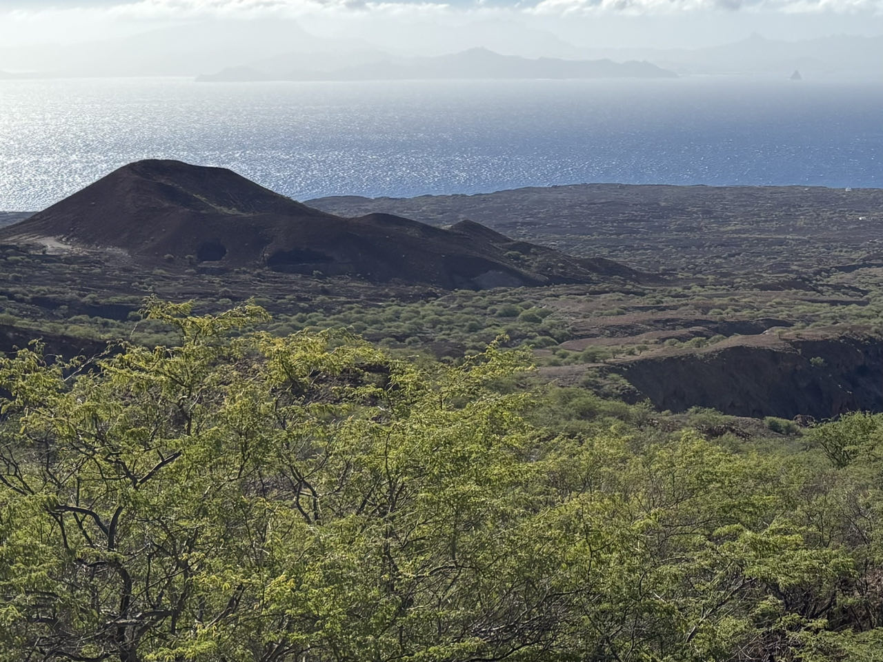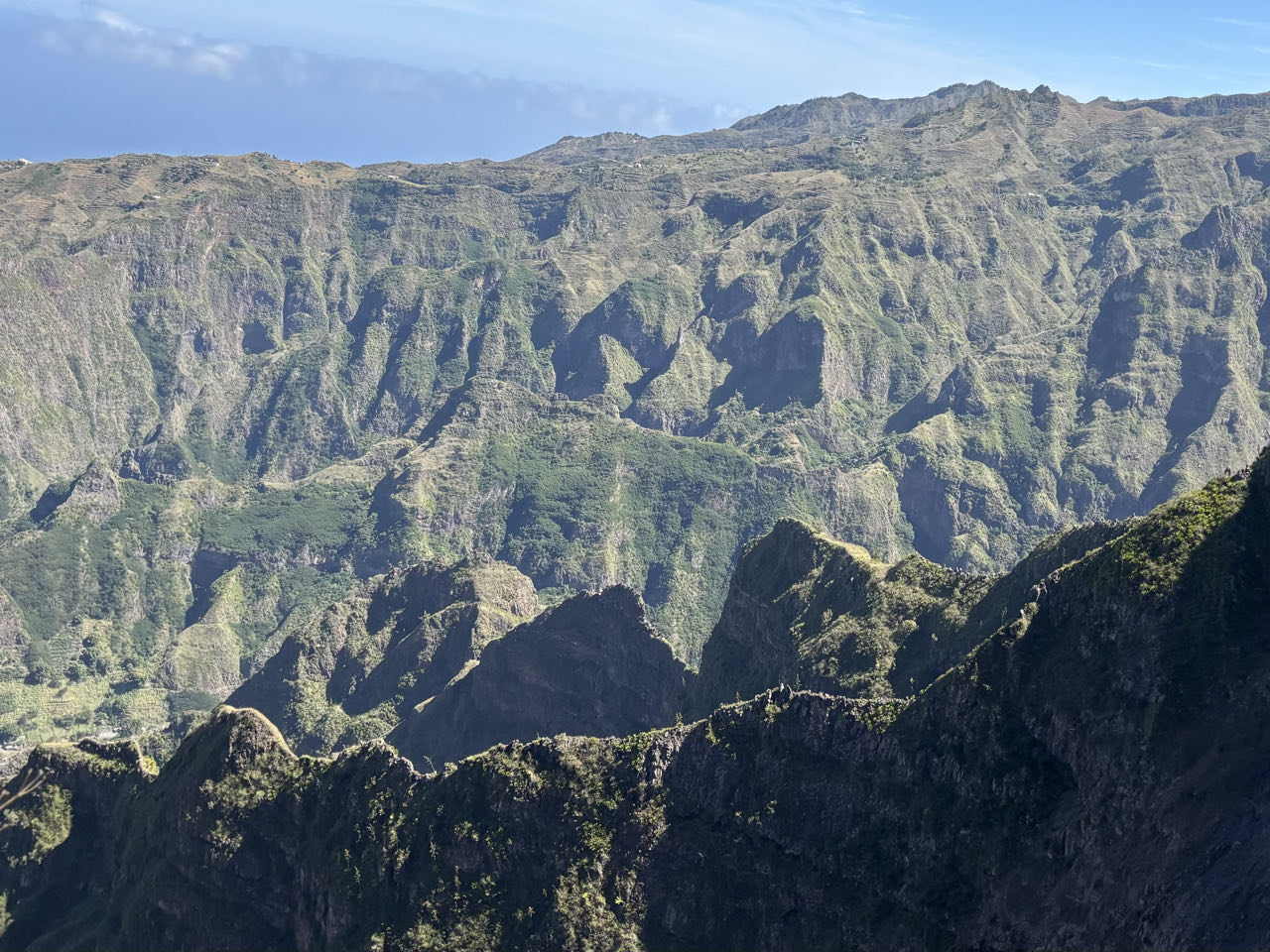 We staan extra vroeg op vandaag. Het ontbijt is om half zeven, want de pont naar San Antao vertrekt om 8 uur precies. Onze kapitein heeft de kaartjes geregeld en ervoor gezorgd dat er een gids met een busje voor ons klaar staat aan de overkant. Het is nog een beetje fris als we vertrekken, dus we doen een dunne trui over ons T-shirt aan.![]()