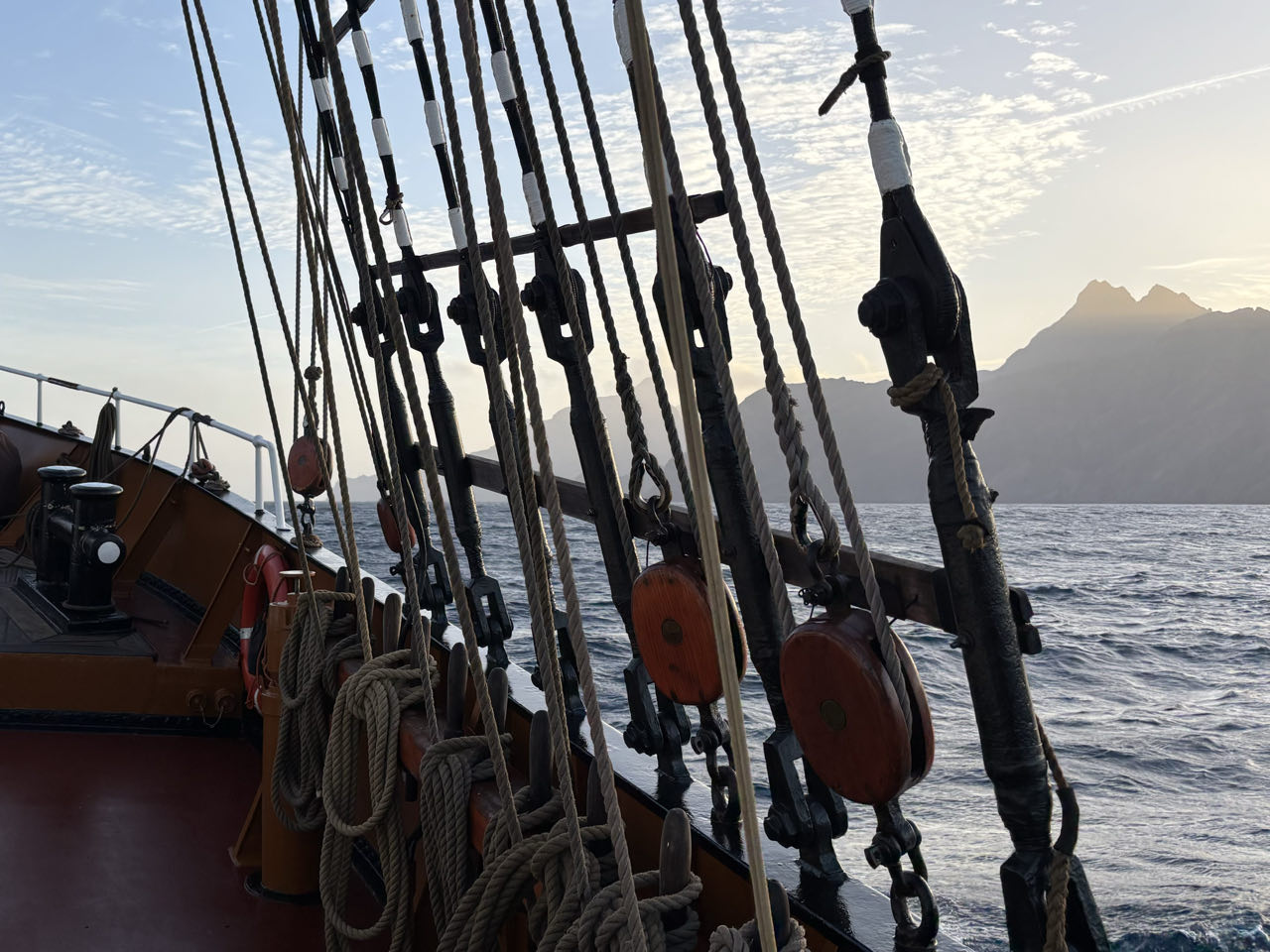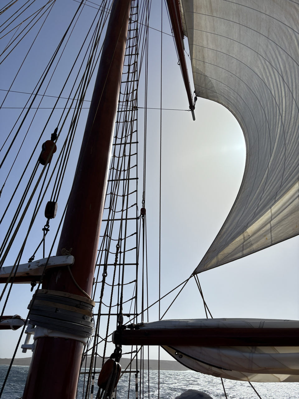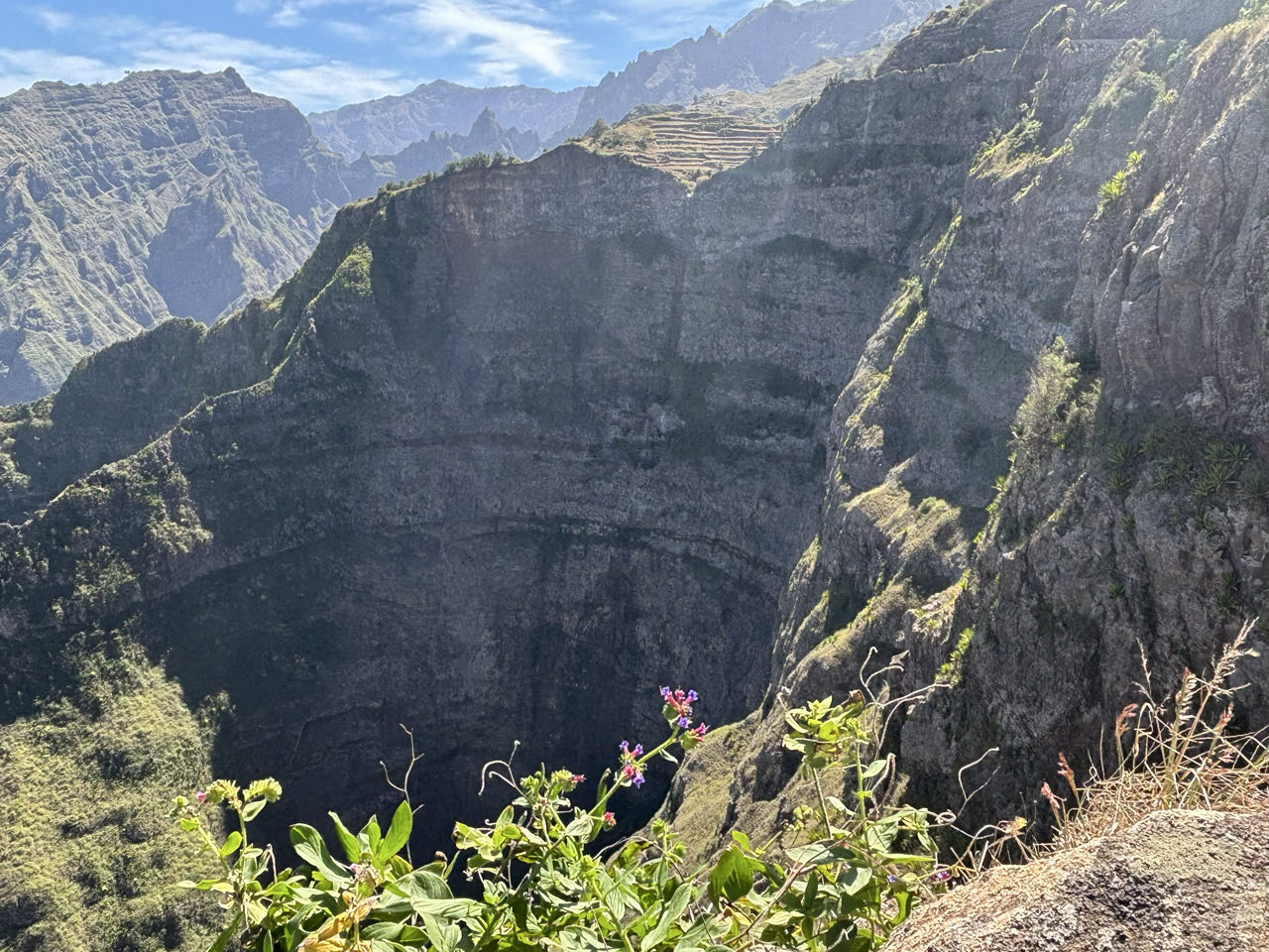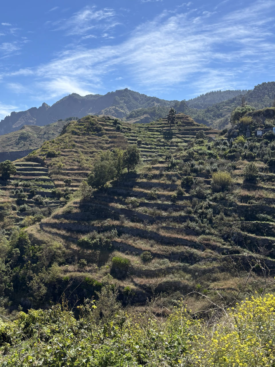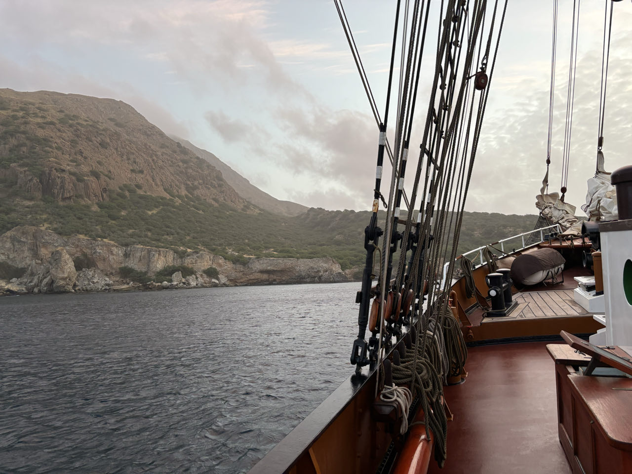 We staan extra vroeg op vandaag. Het ontbijt is om half zeven, want de pont naar San Antao vertrekt om 8 uur precies. Onze kapitein heeft de kaartjes geregeld en ervoor gezorgd dat er een gids met een busje voor ons klaar staat aan de overkant. Het is nog een beetje fris als we vertrekken, dus we doen een dunne trui over ons T-shirt aan.![]()