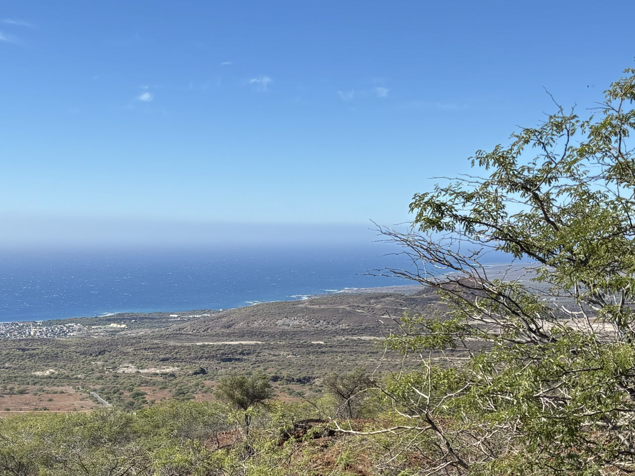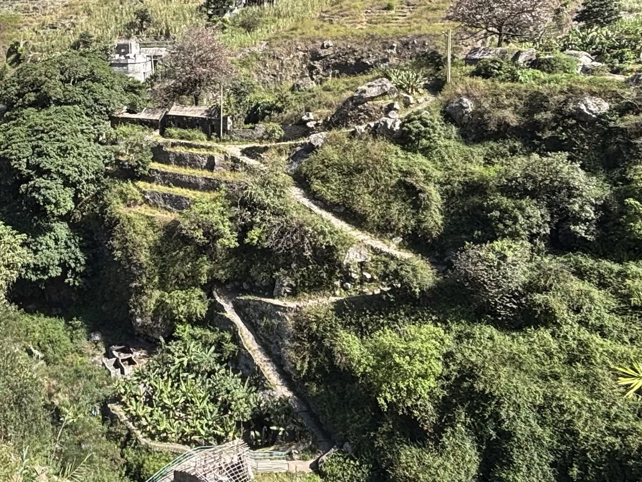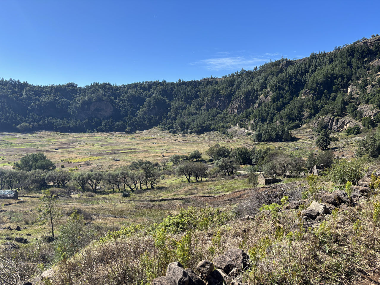 Ik voel na tien minuten mijn ene knie al protesteren, dus ik keer om. Jakob loopt verder door naar boven en keert daar pas om. Het is prachtig daar zo hoog op de berg. De krater bestaat uit een vruchtbaar stuk land, waar van alles verbouwd wordt en ook wat mensen wonen.