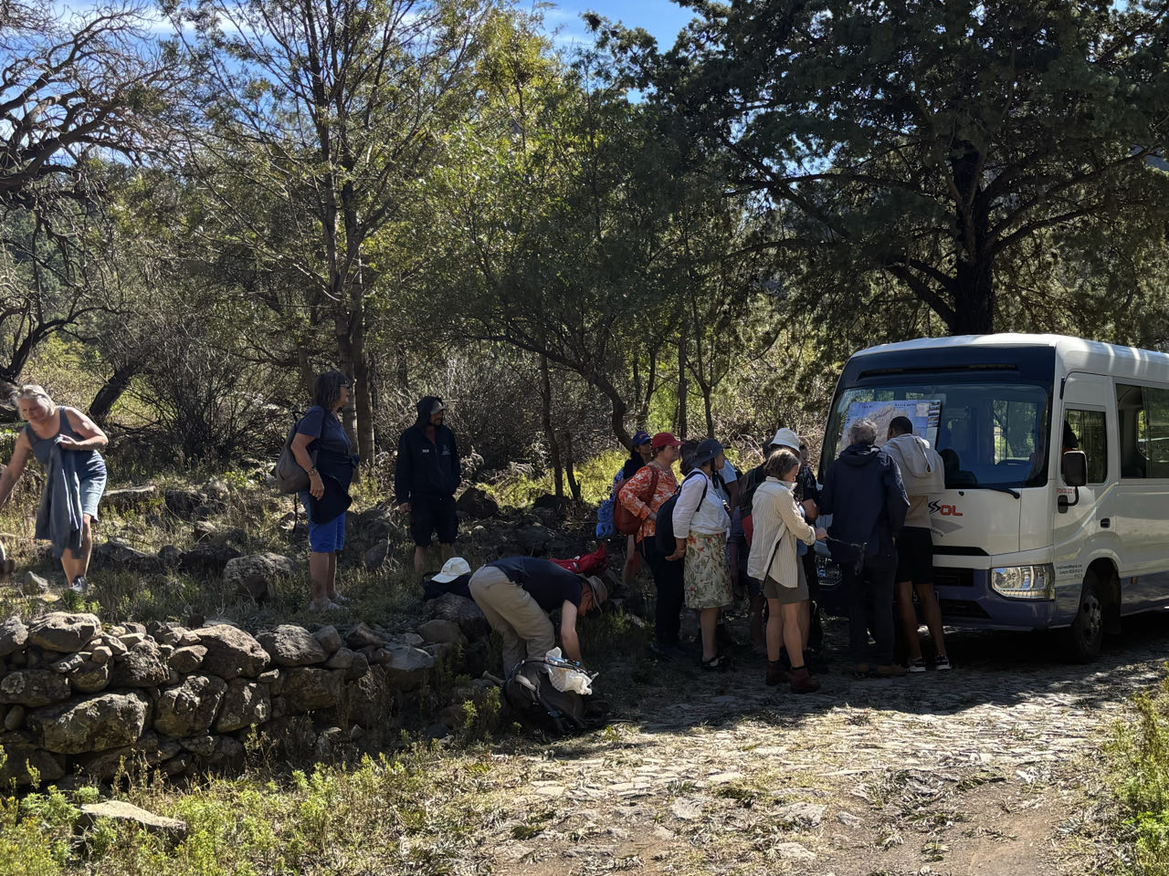 De tocht door de bergen in fantastisch. Wat een prachtige natuur! De chauffeur vertelt dat deze weg van ‘cobblestones’ vanaf 1950 gebouwd werd en na 15 jaar klaar was. Wat een project! Na een uur of twee komen we bij het restaurantje voor de lunch. De wandelaars zijn intussen ook aangekomen. Wat een fantastisch eten krijgen we daar! Te veel van het goede!! En ook nog ijs en koffie toe.