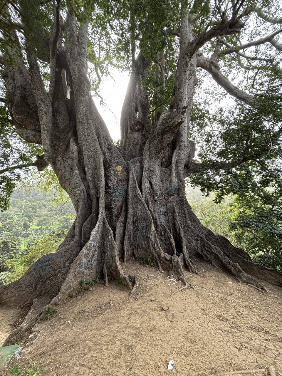 Via steile hobbelige weggetjes gaan we omhoog. De boom is enorm. Tot slot rijden we nog een heel eind door groene heuvels en over kronkelige wegen om bij een zwart strand te komen. Een paar stoere groepsgenoten gaan het water in. Wij niet! Om half 6 worden we weer opgepikt bij het haventje van Tarrafal. We hebben veel gezien en zijn weer klaar voor een zeildag morgen.