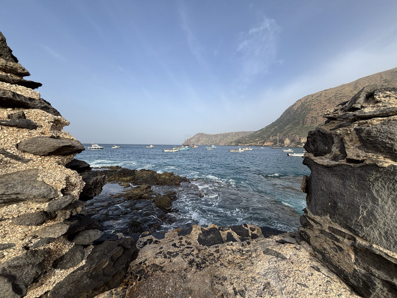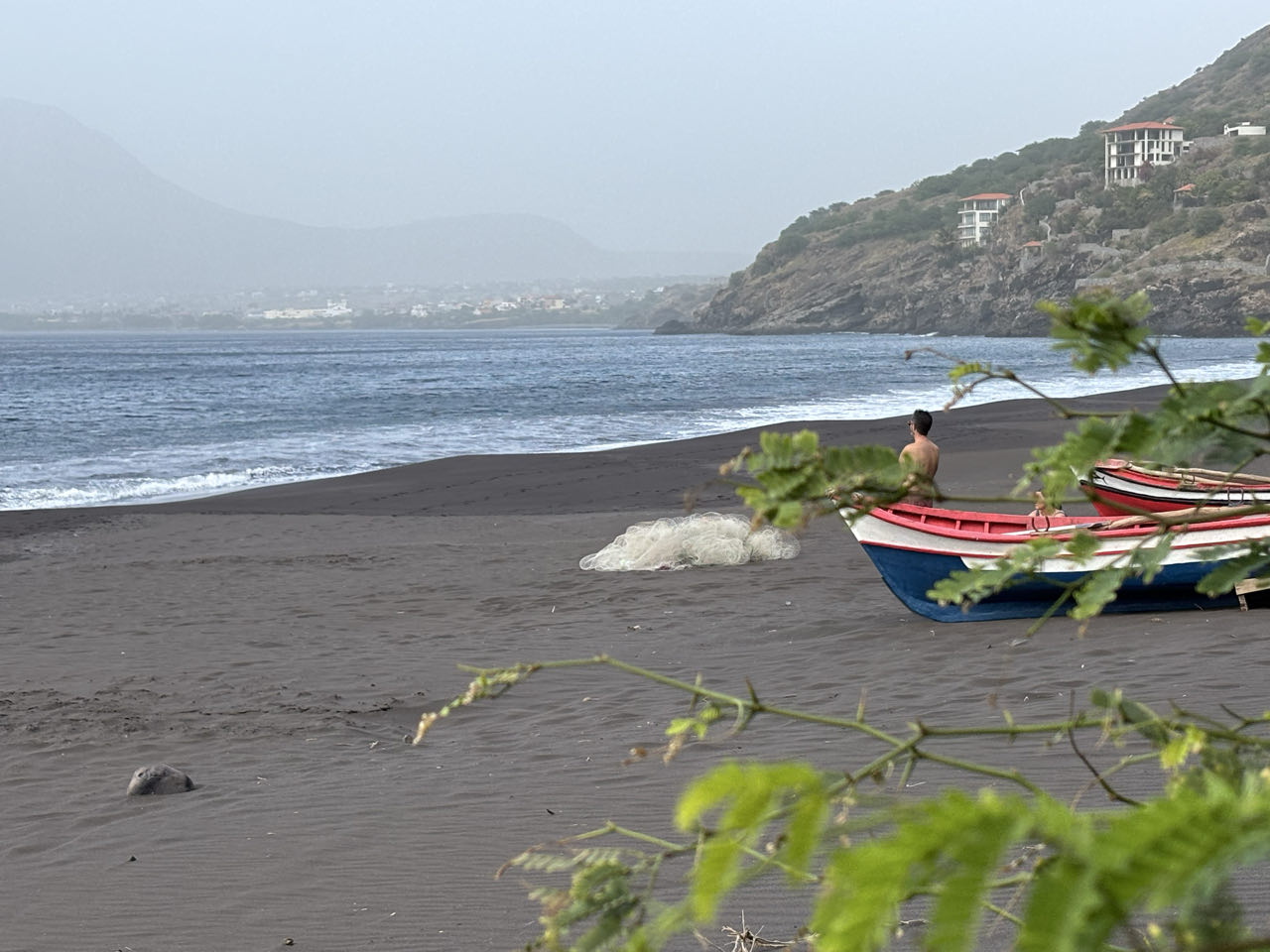 Nadat het anker gevallen is, wordt het heerlijk rustig in m’n kooi. Ik hoef niet meer bang te zijn om eruit te vallen. De handdoek die ik onder de rand van de matras had gestoken heeft me mooi tegengehouden. Na het douchen ga ik snel naar buiten om de baai te bekijken. Ruim 10 jaar gelden kwamen we hier in Tarrafal aan met onze eigen Jonas. Waar blijft de tijd!![]()