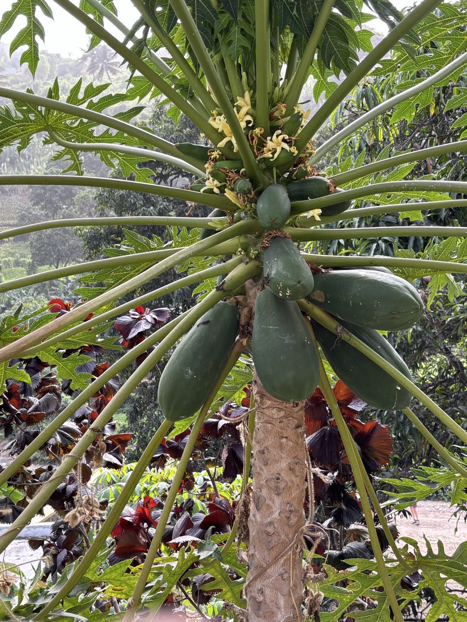 We lopen een rondje en gaan lunchen bij Pingo Pingo. Er verschijnt heel veel eten op tafel. Een bonenschotel, rijst, groente, vis en kip. Dan volgt ook nog een toetje met koffie. We kunnen er weer tegen! De volgende stop is bij de grootse kapokboom van het eiland.