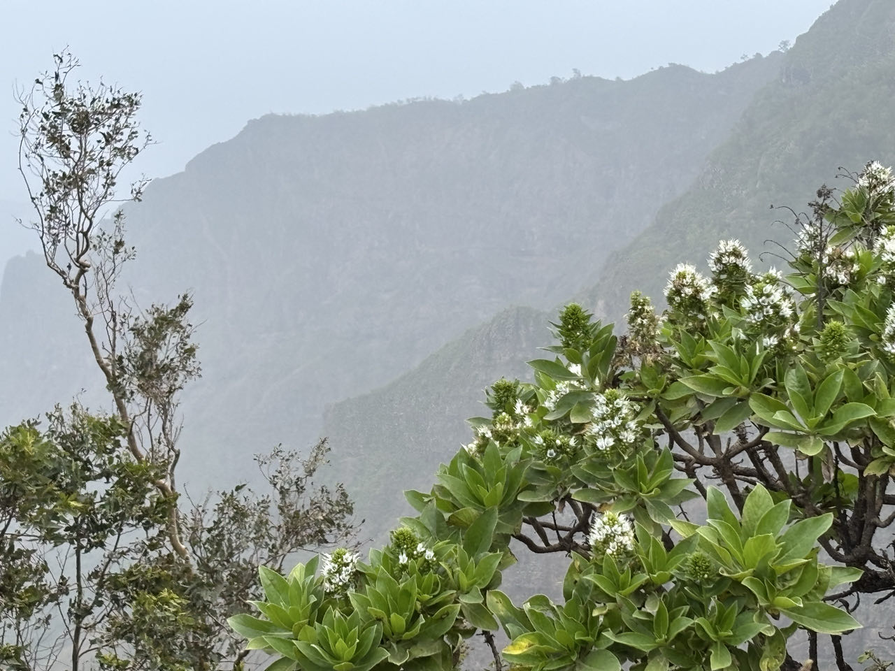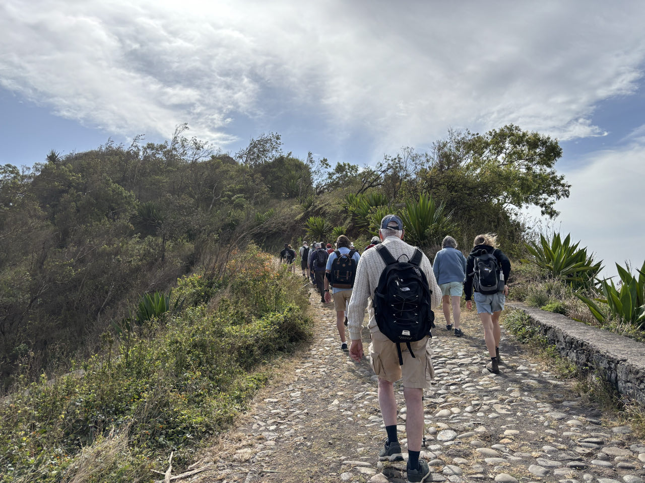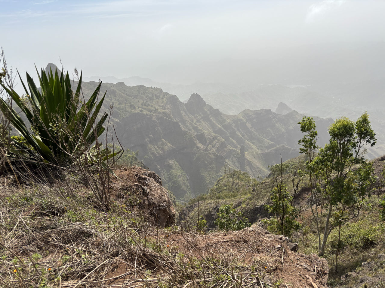 Na het ontbijt vertrekken we met de dinghy naar de wal. Er is geen echte aanlegplaats, dus we worden via de punt op de kant gezet. Zolang er geen golf komt gaat dat goed. Als iedereen aan wal is, stappen we in twee busjes voor een rondrit over het eiland. Het is erg groen en begroeid hier. Mooi om te zien. We beginnen met een wandeling op de berg Pico ‘d Antonia. Met het busje gaan we tot 600 meter en daarna lopen we zelf een uur omhoog. Best pittig, maar het is een mooie wandeling.![]()