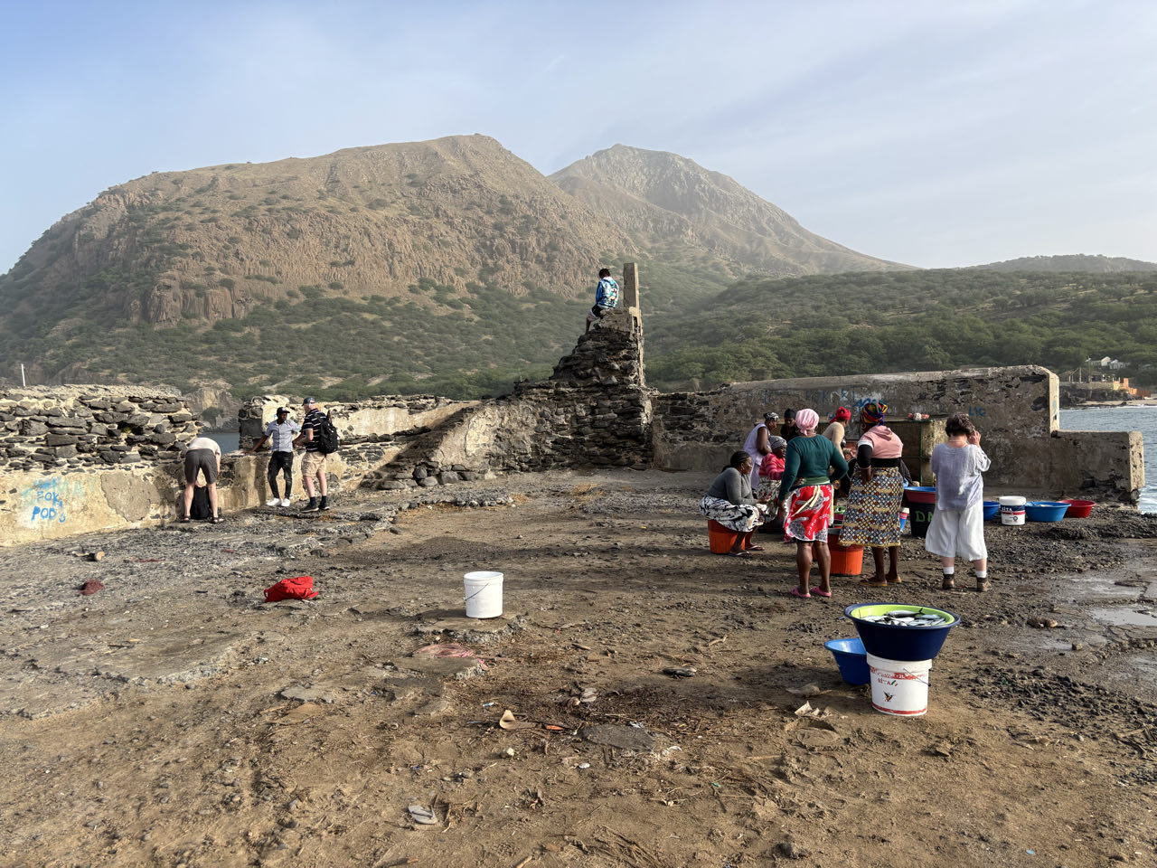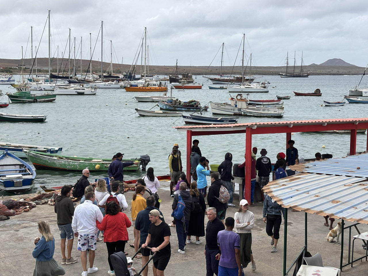Vervolgens lunchen we in Espargos, de hoofdstad van het eiland voor 11 euro inclusief een drankje. We kiezen voor cachupa, het nationale gerecht en het smaakt prima. We lopen nog een rondje en zien de nieuwe voorraad tweedehands kleren die net is afgelevrd op de markt.